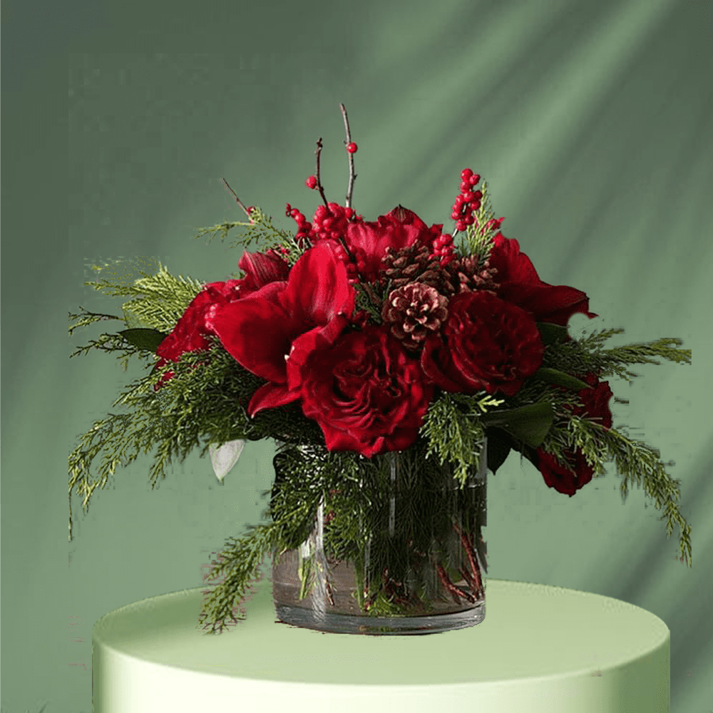Centro de mesa para noche buena, base de vidrio circular o cuadrada de acuerdo a disponibilidad, con 6 rosas, variedad de follajes ciprés y detalles navideños.