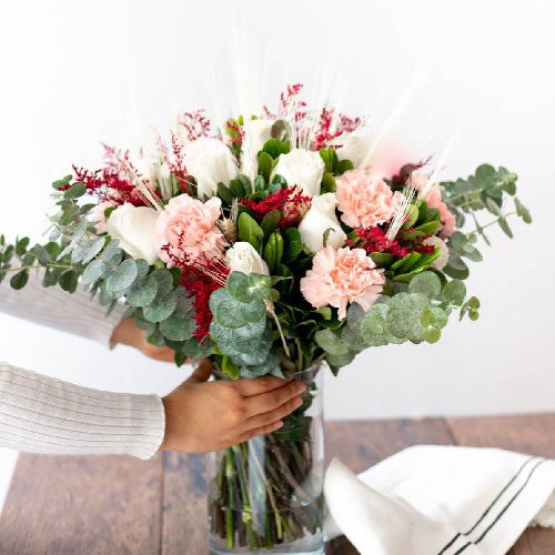 Florero Navideño, con 10 rosas blancas, claveles, trigos, caspio blanco, eucalipto dollar y hoja brillante, todo en florero de vidrio recto.