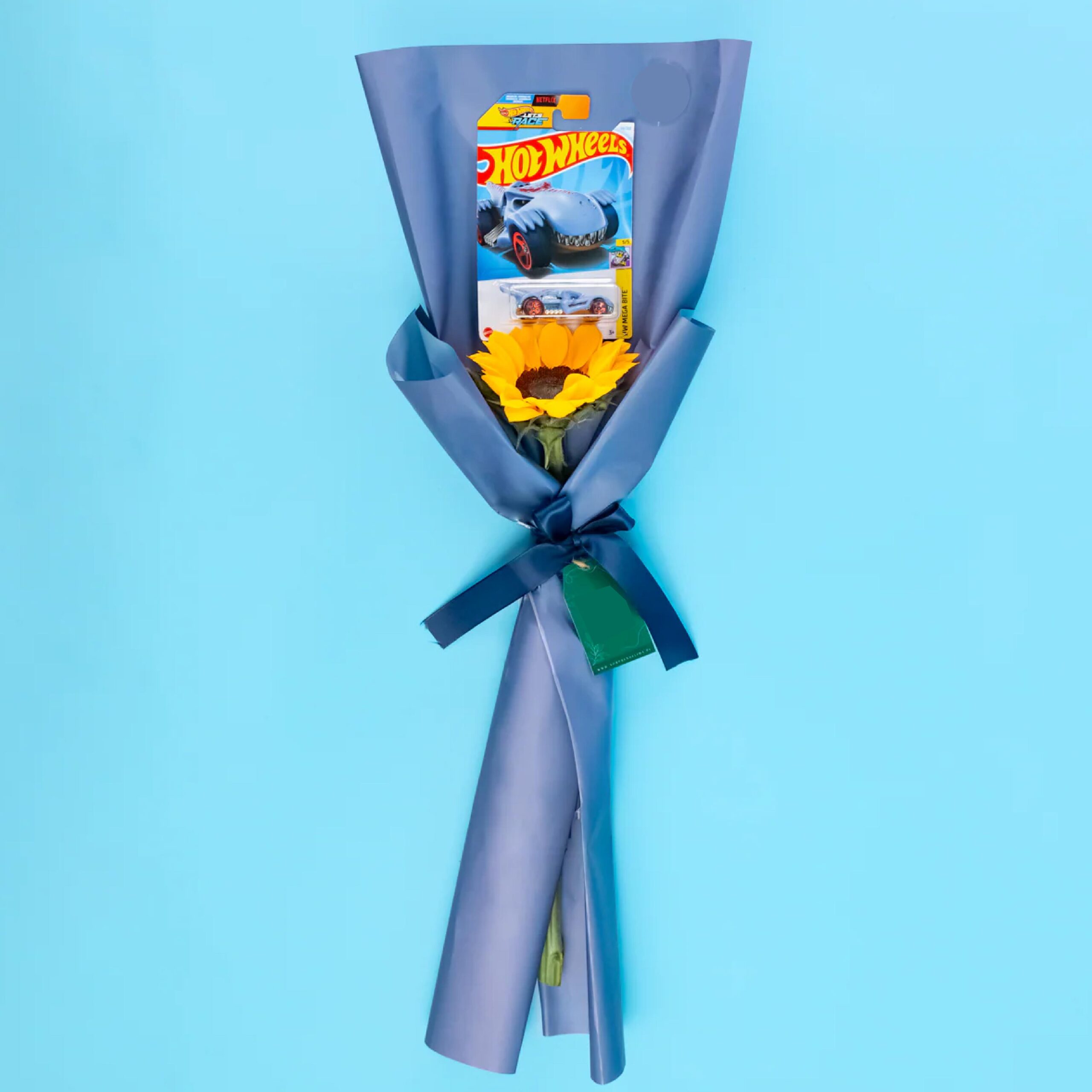 Un detalle pequeño pero lleno de significado. 🌻✨ Este ramo incluye un hermoso girasol fresco acompañado de un carrito Hot Wheels de colección, envuelto de papel coreano azul y liston.